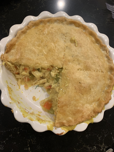 6. Pour the filling into a 2-quart baking dish. Roll out the pie crust on a floured surface and lay it over the top of the dish. Press the dough so that the edges stick to the outside of the pan. Use a knife to cut little vents here and there in the surface of the dough.